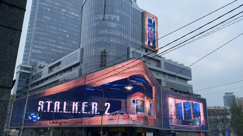 Для досягнення нашої мети створили яскравий ролик у 3D форматі для формування WOW-ефекту, який підкреслив масштаби потужної колаборації S.T.A.L.K.E.R. та NON STOP і технологічність довгоочікуваної гри. Щоб максимально ефективно презентувати нашу ідею, ми обрали як основу розміщення найбільший LED-екран Європи – ТРЦ Gulliver. Цей вибір дозволяє нам максимально реалістично відображати контент, залучити увагу аудиторії до нашого проєкту та формує високу залученість з боку аудиторії до шерингу контенту.